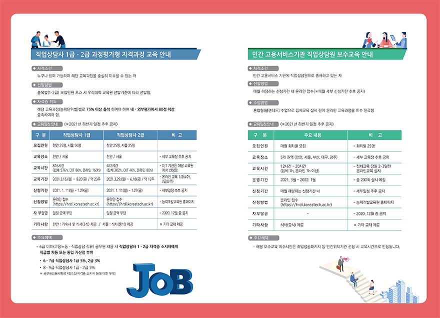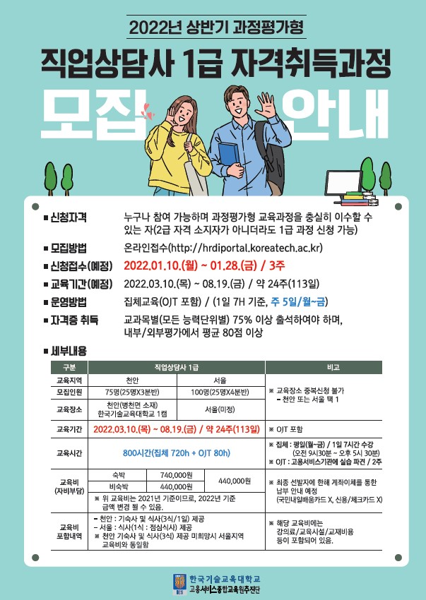 ◆ 과정평가형 자격취득 과정 ◆ 자격조건: 누구나 참여 가능하며 해당교육과정을 충실히 이수할 수 있는 자 ◆ 자격증 취득: 해당 교육과정(능력단위별)별로 75% 이상 출석 하여야 하며 내ㆍ외부평가에서 80점 이상 충족하여야 함. ◆ 문의 : [ 한국기술교육대학교 고용서비스TF팀 ☎ 041-521-8181, 8184~7 ] ◆ 자세한 내용은 한국기술교육대학교 능력개발교육원 홈페이지에서 확인하세요 직업상담사 1급과정 : https://hrdi.koreatech.ac.kr/hrdi/CMS/Contents/Contents.do?mCode=MN061 직업상담사 2급과정 : https://hrdi.koreatech.ac.kr/hrdi/CMS/Contents/Contents.do?mCode=MN062 ![]() ![]() ![]() |
