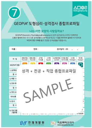 ◈ 7번-종합프로파일( B4 사이즈 4P) (성격 + 전공 + 직업) 출시안내GEOPIA도형심리 온라인검사 & OMR카드 단체검사 결과를개인별 점수표로 출력가능하도록 제작되었습니다.1P : 종합점수표 2P : 성격프로파일3P : 전공프로파일 4P : 직업/직무프로파일 (주)티앤티인재개발원쇼핑몰 : http://shop.tnthrd.com/shop/