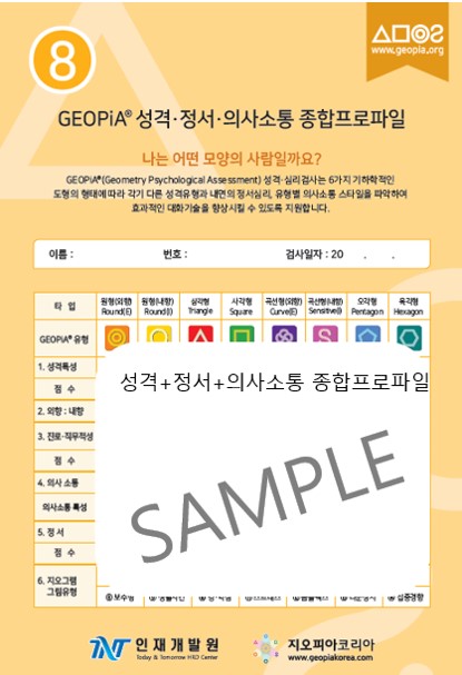 ◈ 8번-종합프로파일( B4 사이즈 4P) (성격 + 정서 + 의사소통) 출시안내GEOPIA도형심리 온라인검사 & OMR카드 단체검사 결과를개인별 점수표로 출력가능하도록 제작되었습니다.1P : 종합점수표 2P : 성격프로파일3P : 정서프로파일 4P : 의사소통프로파일 (주)티앤티인재개발원쇼핑몰 : http://shop.tnthrd.com/shop/