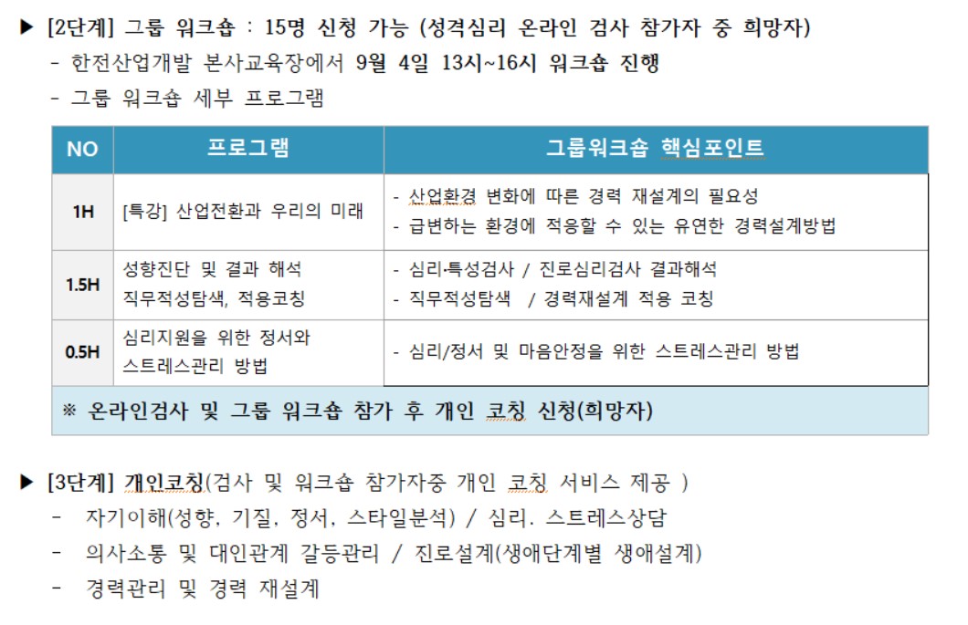 약 30분 정도 시작하면 끝까지 마무리 해야 합니다. ◈ 반드시 그림 검사를 완료하시고 다음 진행하세요 (그림 검사가 완료되지 않으면 오류가 발생할 수 있습니다) 1. 홈페이지 접속 - 회원가입(기업회원) 2. 콘텐츠- 성격심리검사 - 접속 - 단체검사 하기 클릭 https://www.tnthrd.com/sub/sub22.htm 앞에 붙여서 정확히 입력하면 검사 시작됩니다. ===================================================================================================== ◈ 검사 완료 후 9월 14일 13시~16시 서울 본사 교육장(한전산업개발)에서 그룹 워크숍이 진행됩니다. 개인별 해석 코칭 받으실 분은 16시~ 17시까지 진행될 예정입니다. ◈ 장소 관계로 선착순 15명까지 신청 가능합니다. (문자 발송된 번호로 9월 13일 15시까지 신청 접수 마감) ◈ 워크숍 당일 개별 상담을 신청할 수 있습니다 ( 전문 상담원 3명 참석 예정 ) ◈ 문자로 신청 해주신 분은 접수 완료 되었습니다. ----------------------------------------------------------------------------------------------------------------- [ 워크숍 및 개별 상담 서비스 내용 참조] ![]() ------------------------------------------------------------------------------------------------------------ ◈ www.geopia.org 홈페이지 공지사항 참조하세요 ◈ 기타 문의 사항 : 02- 446 - 6587 ======================================================================================================================== ![]() ========================================================================================== ![]() |