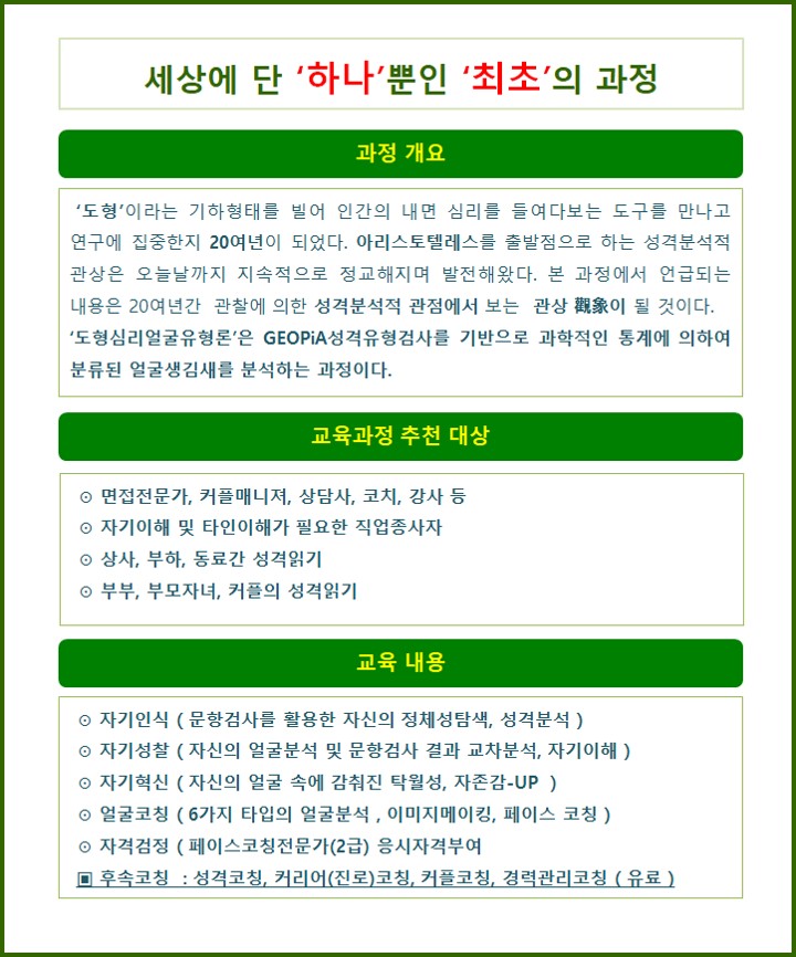 ◈ GEOPiA® 도형심리 페이스코칭-얼굴분석◈ ▧ ZOOM 교육일정 : 2026년 12월 20일(토) 오전 10시~ 오후 4시 30분 ▧ 교육비용 : 35만원(자격검정/발급료 별도 / 자료실 참조 ) ◈ 수료 후 강사과정(자격과정운영 파일 별도 신청가능 ) ◈-----------------------------------------------------------------------◈ ★ 국내외 최초로 개발되고 특허등록 되었으며 타당화연구논문으로 검증된 한국형 MBTI 라고 할 수 있는 GeoPiA 도형심리.성격검사를 기반으로 하는 페이스코칭 민간자격취득 과정입니다. ★ 적정 인원이 안될 경우 폐강 될 수 있습니다 / 강사과정 신청시 온라인과정 재수강 제공 ★ 전체교육일정보기 : https://www.tnthrd.com/bbs/?BBSDivisionID=3 ◈ 과정문의 ◈ ★ ☎ 02–446–6587 / Fax : 02-447-6587 ★ 교육비입금계좌 : 국민은행 866401- 04-110401 (주)티앤티인재개발원 ★ 홈페이지 : (주)티앤티인재개발원 www.오미라.com ◈ 더궁금하시면 : 유투브 : 오미라성격심리연구소~~ https://www.youtube.com/channel/UC1-Oz1GC5wsFQ7Uh9pNp6XQ ![]() ![]() ![]() |